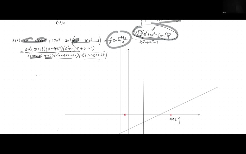The remainder (after long division) has a 5th-degree numerator. Setting this equal to zero tells us where \(R(x)\) intersects its slant asymptote.