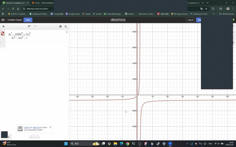 The denominator is a 6th-degree polynomial — impossible to factor by hand in general. Using Desmos or a graphing calculator, we identify: