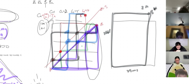 - Catalan numbers: The number of such paths that never cross above the main diagonal is \(C_n = \frac{1}{n+1}\binom{2n}{n}\).