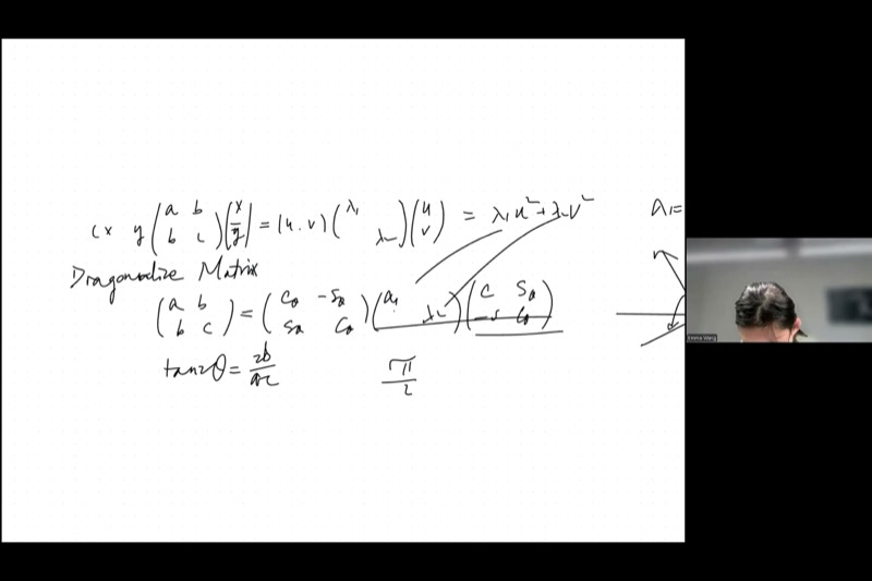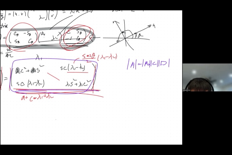This lesson pulls together the threads from previous sessions: the quadratic form, rotational matrices, the tangent formula for finding the rotation angle, and two powerful invariants (the trace and the determinant) that let you find eigenvalues without computing the rotation at all. By the end, you will see how the equation \(M\vec{\varepsilon} = \lambda\vec{\varepsilon}\) defines eigenvalues and eigenvectors — one of the most important equations in all of mathematics and physics.