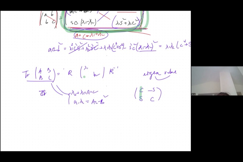 After finding \(\theta\), you compute \(\cos\theta\) and \(\sin\theta\), plug into the rotated matrix, and read off \(\lambda_1, \lambda_2\). This works but involves a lot of trigonometric algebra.