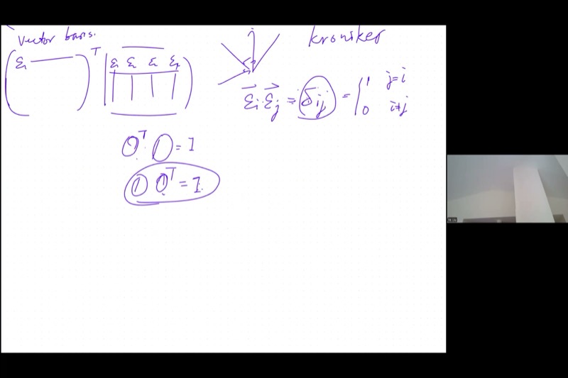 Why this works: When you multiply \(O^T O\), the \((i,j)\) entry is the dot product \(\vec{\varepsilon}_i \cdot \vec{\varepsilon}_j\). Since the columns are orthonormal: