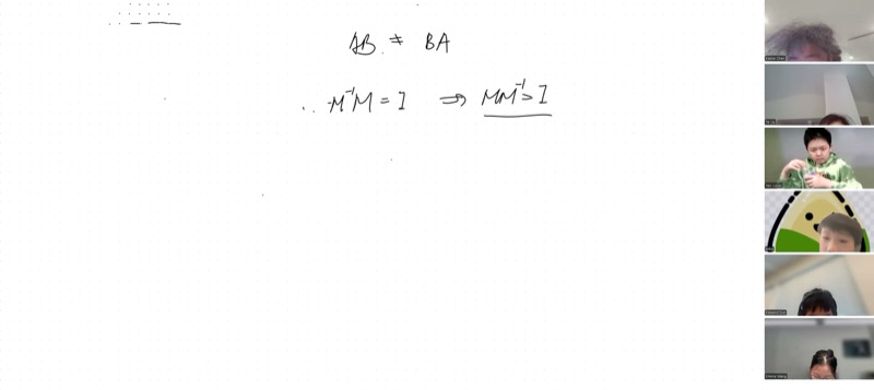 Matrix multiplication is not commutative in general: \(AB \neq BA\). So it is not obvious that if \(M^{-1}M = I\) (left inverse), then \(MM^{-1} = I\) (right inverse). Here is the elegant proof developed in class.